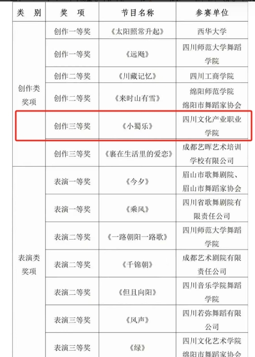 首届成绵德眉资原创舞蹈大赛近日公布获奖名单,经过激烈角逐,人文与国际教育学院舞蹈表演专业原创剧目《小蜀乐》,从65组参赛作品中脱颖而出,成功晋级决赛,最终荣获创作三等奖。