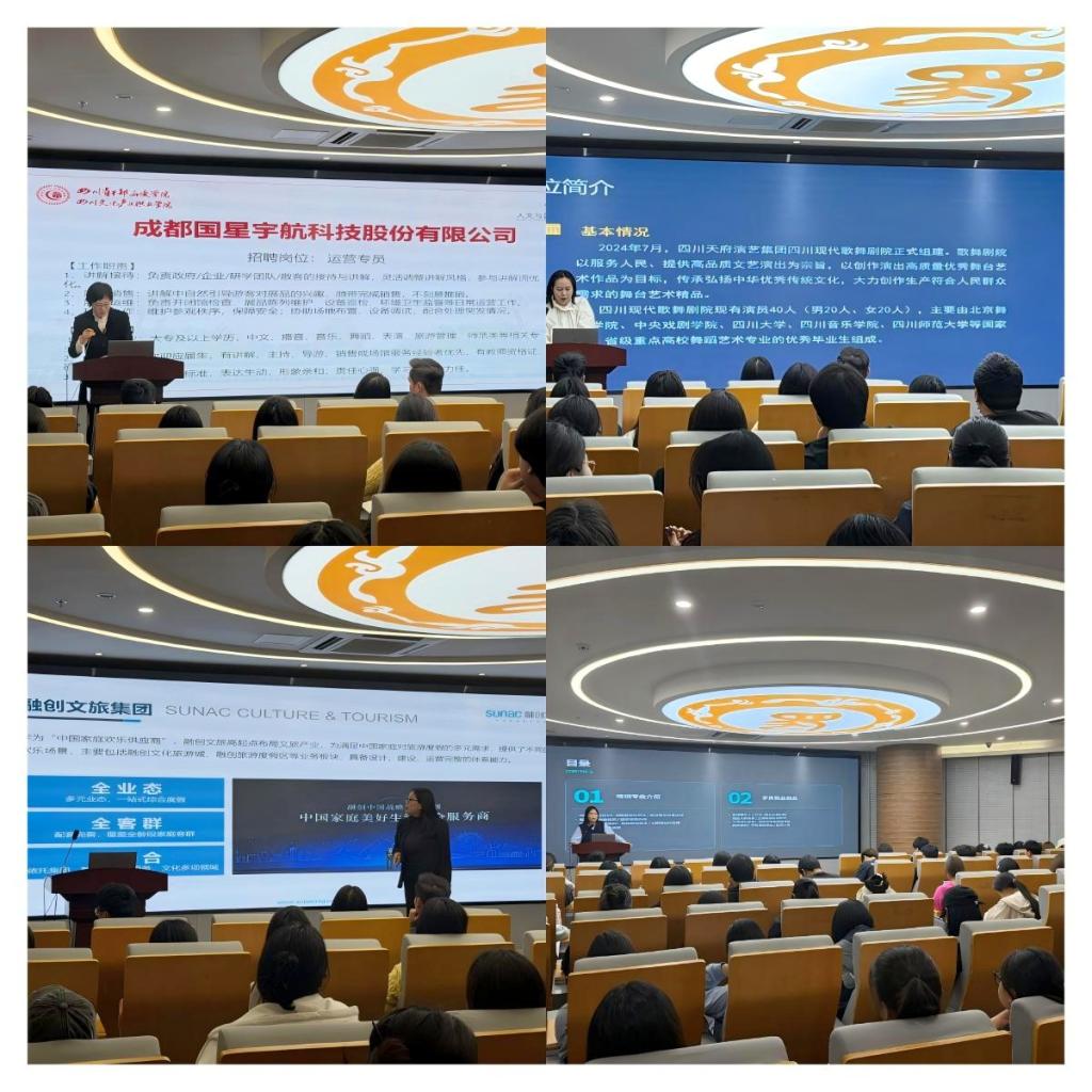 学院邀请成都国星宇航科技股份有限公司、四川现代歌舞剧院、成都融创文化旅游管理有限公司、成都九州山海科技有限公司等企业进校宣讲。各企业代表围绕企业概况、岗位需求、职业发展路径等内容进行了介绍,帮助同学们进一步了解行业发展和就业方向,为学生拓宽就业渠道。